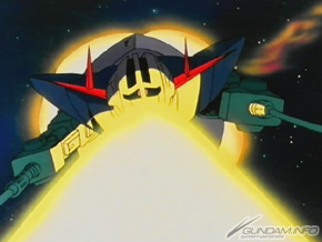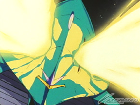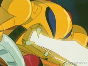 正如所見,兩手長著巨大電熱鐮刀的這台機體,高速移動後以擴散MEGA粒子砲攻撃,從敵方的死角開始急遽加速,以如此兇猛的氣勢加上巨大的電熱鐮刀將敵機 一刀兩斷!想定如此獨特又暴力有如攔路砍人(?)的攻撃方法並且開發完成,但實際上因為運動性能不佳,結果沒有投入量産(……)。