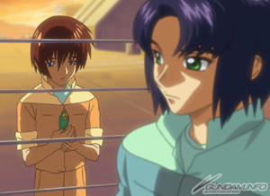 雖然是在戰場以外久違的相會,阿斯蘭的身後不遠處就是ZAFT克魯澤隊的成員一直盯著,阿斯蘭直接說「嗯,我不認識這個人哦~」然後演出不論怎麼說都像是初次見面的態度(←阿斯蘭,真會演戲啊~!)。