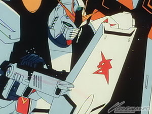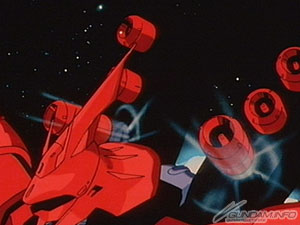 這邊的感應砲本體和ν高達的鰭狀感應砲不同,還沒使用的時候會變成圓筒形。感應砲自本體射出後,分離的蓋子會向四方展開,光束砲也伸長進入攻撃態勢。而且 與過去的感應砲相比光束威力和運作時間效能也都大幅度提升! 和在『機動戰士高達』當中被打到體無完膚的時候相比可是大不相同啊! 面對阿姆羅駕駛的高達 也完全不覺得會輸啊(←唉呀、旗標又立起來了)。