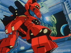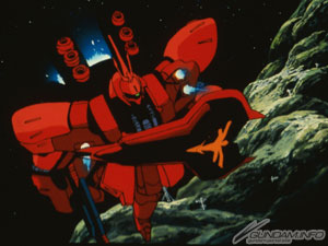 介紹完阿姆羅・雷的機體,當然也要介紹他的對手-新生新・吉翁總帥,馬沙・亞斯洛布搭乘的MS(←不論是三倍速或是紅通通都一點沒變呢)沙煞比 (MSN-04 全高:25.6m,本體重量:30.5t),當然不能不好好介紹啦! 這個機體是舊 新・吉翁的技術人員設計,算是先前的吉翁系MS的集大成。為了製造這台機體需要的設備不足,因此也不是由新生新・吉翁軍内部製造,而是與高達同樣委託安納 罕電子公司開發,並且在格拉那達的工廠中製造的(←有點囉嗦呢)。
