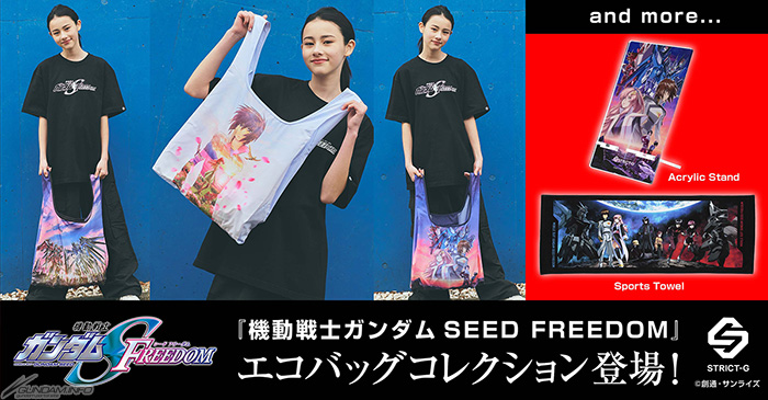 由採納高達世界觀的成衣商店「STRICT-G」推出,『機動戰士高達SEED FREEDOM』的「環保袋」3種、「主視覺 壓克力立牌」、「長條視覺 運動毛巾」的預約販售,於今天2月16日(五)13:00開放。