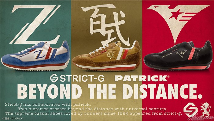 採納高達世界觀的成衣商店「STRICT-G」的系列服飾商品線,和法國布鞋品牌「PATRICK」的3款合作款式球鞋,將於3月20日(六)發售。