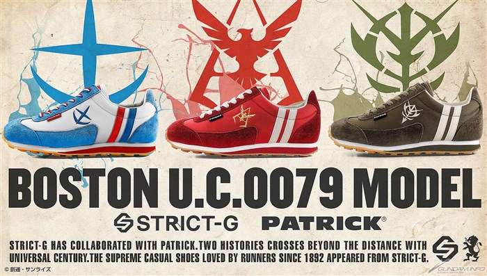 採納高達世界觀的成衣商店「STRICT-G」,將於5月1日(六)發售3種和法國運動鞋品牌「PATRICK」和『機動戰士高達』的聯名運動鞋。