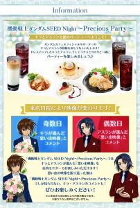 「高達SEED Night -Precious Party-」上,將會由擔任高達官方代言人的『機動戰士高達SEED』人物居拉・大和與亞斯蘭・察拉,負責招待各位參加派對。活動中準備了4種豪華套餐,以及隨附收藏小卡的飲品、單品餐點等內容。