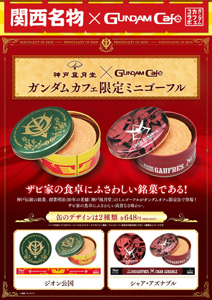 迷你法蘭酥將推出GUNDAM Café限定設計的「自護公國」和「馬沙・亞斯洛布」2種,內含香草・草莓口味・巧克力3種口味。