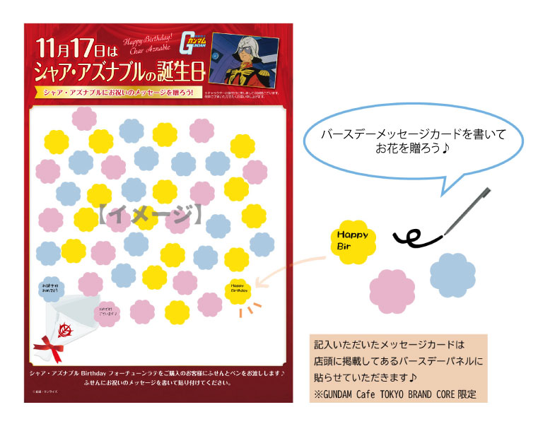 在購買「馬沙・亞斯洛布 Birthday fortuneLatte」時拿到的”留言卡”上,寫下祝賀的留言,裝飾到架設在「fortuneLatte Cafe」門口的Birthday展示板上吧。舉行期間至11月17日(二)為止。