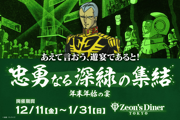 互動型娛樂主題餐廳設施「GUNDAM Café TOKYO BRAND CORE(GUNDAM Café TOKYO)」的「Zeon’s Diner TOKYO」,將於12月11日(五)舉辦「忠勇深綠的集結~跨年宴會~」。