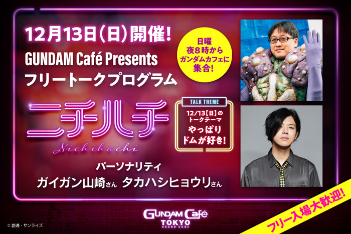 互動型娛樂主題餐廳設施「GUNDAM Café TOKYO BRAND CORE(GUNDAM Café TOKYO)」決定於12月13日(日)晚間20:00起舉辦免費座談節目「NICHIHACHI」。