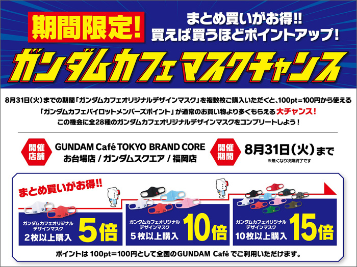 活動中只要購買複數枚「GUNDAM Café原創款式口罩」(各含稅825日圓),將可以比平常購物獲得更多「GUNDAM Café駕駛員會員點數」。2枚以上點數為5倍、5枚以上為10倍等,將隨購買數量變更。
