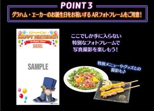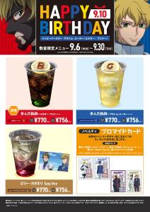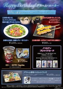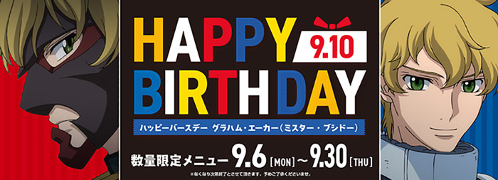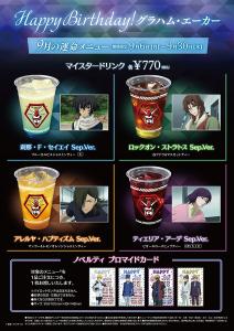 慶祝於9月10日(五)迎接生日,來自『機動戰士高達00』的格拉漢姆・耶卡(Mr.武士道)的”數量限定餐點”(甜點/飲品)登場。此外,在同期間中也有以格拉漢姆及Mr.武士道名台詞設計的特別餐點,也販售了比利・片桐等和格拉漢姆有淵源的5名角色飲品。