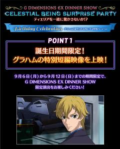 GUNDAM CaféTOKYO在9月6日(一)期間限定至9月12日(日)舉辦「CELESTIAL BEING SURPRISE PARTY ~要一起為提耶利亞來場驚喜嗎?~」,慶祝格拉漢姆的生日的”特別版本”。