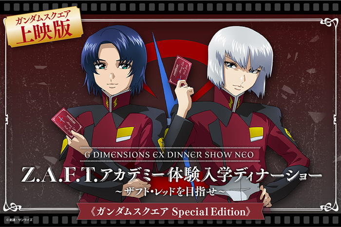 首次在GUNDAM SQUARE舉辦的晚餐秀「Z.A.F.T.學園體驗入學晚餐秀~目標札多紅衣~GUNDAM SQUARE Special Edition」,將會對GUNDAM Café TOKYO的「G DIMENSIONS EX DINNER SHOW NEO」作出部分内容變更來舉行。