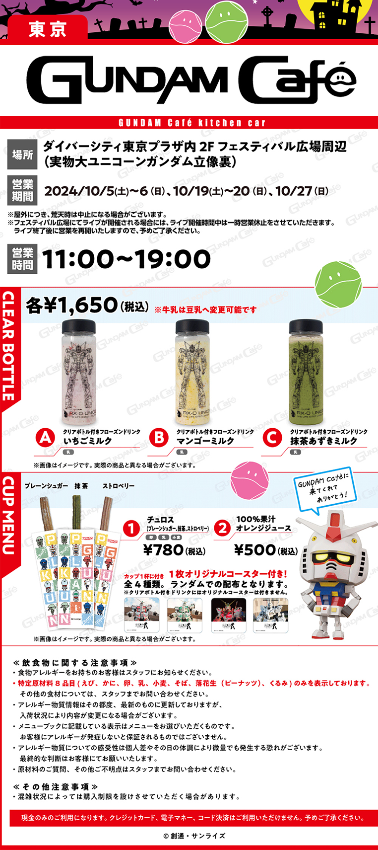 此外,「GUNDAM Café」餐車決定於10月5日(六)、6日(日)、19日(六)、20日(日)、27日(日)於東京・實物大獨角獸高達立象後方展店。餐車將販售附「實物大獨角獸高達立象」款式水瓶的冰沙以及附獨家杯墊的即拿棒、100%果汁柳橙汁等。
