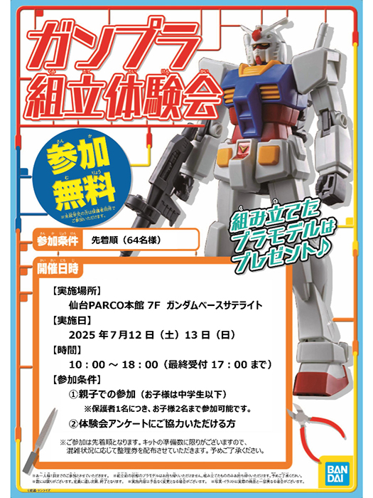 「高達組裝體驗“決定於7月12日(六)及7月13日(日)在宮城縣THE GUNDAM BASE SATELLITE SENDAI(仙台高達基地)舉辦。 參與是免費的。