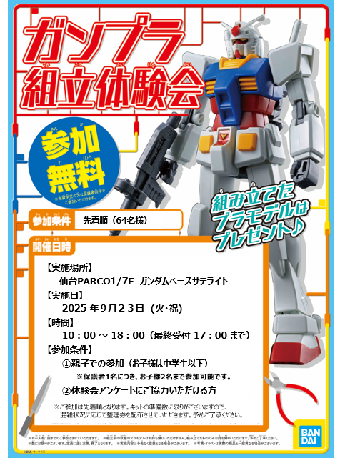 「高達基地衛星仙台」將於9月23日舉辦「高達模型組裝體驗」! 免費參加!