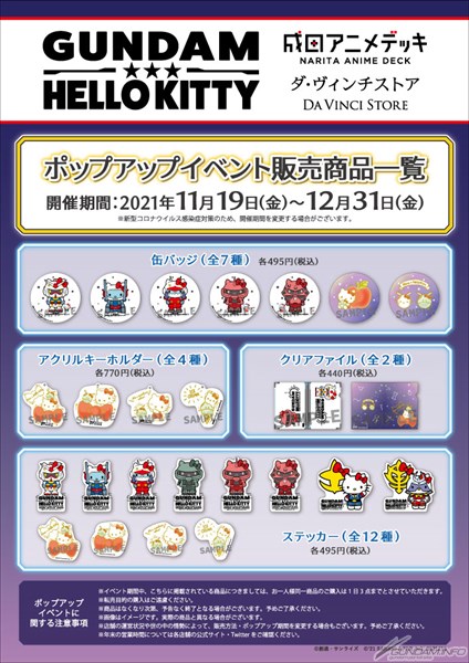 快閃店將會有使用「高達★Hello Kitty」、「馬沙專用渣古II★Hello Kitty」及「哈囉★Hello Kitty」等插圖的精品齊聚一堂。