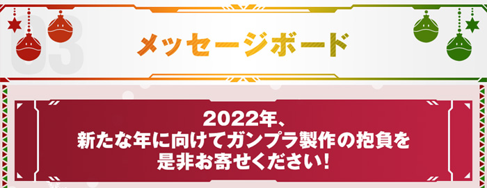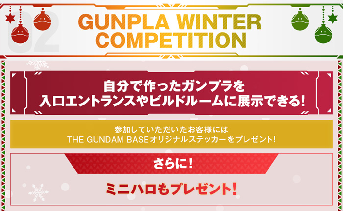 本活動將實施「高達模型組裝體驗會」和「GUNPLA WINTER COMPETITION」、「留言板」。活動期間中,還有準備送給參加者的小禮物,務必來參考看看喔。