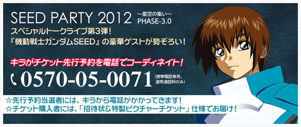 2012 年12月1日(六)在東京・科學技術館science-hal即將舉辦為「機動戰士鋼彈SEED HDREMASTER」Blu-rayBox發售紀念而進行的現場談話活動,第3彈「SEED PARTY 2012 ~聚集的星空~ PHASE-3.0」。本活動入場券可透過直接打電話給『機動戰士鋼彈SEED』的男主角煌・大和來進行事前預約申請喔。本服務將於今日11月5日(一)14:00起,由「VOICE WORLD」(軟體由BANDAI NAMCO GAMES開發)為您提供服務。