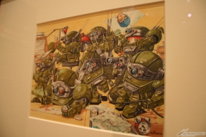 ▲接著是 “很可愛”的機械大集合。加上「斯姆戰士」、「超力機器人」、「魔動王」等等,從高達系列到『機動武鬥傳G高達』的MF都有展示。除此之外就是等身大小以下的MS與眼鏡鬥犬,可以從中窺見大河原老師獨特的玩心,不自覺地彎了嘴角。