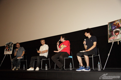 座談會中由動畫評論家的藤津亮太擔任主持人,首先邀請到在『高達UC』負責故事的福井晴敏和製作人小形尚弘上台。『高達UC』中到處可以看到『高達ZZ』的設定和MS,這是為什麼呢?福井先生這麼的喜歡『高達ZZ』嗎?這一類的話題,以及部分的高達迷無法接受『高達ZZ』的理由,都由福井先生在此向大家做說明。