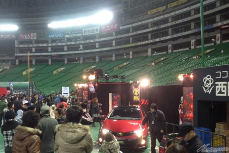設立在一壘側攝影記者席附近的「馬沙專用AURIS」展示攤位上,由於市售款車輛首次登陸九州,因此吸引了許多參觀者。