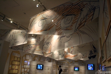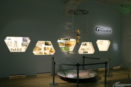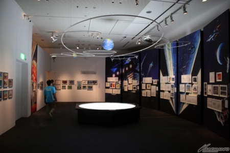 ▲也有許多由中村光毅繪製的『機動戰士高達』美術圖像。天花板還展示了可以簡單了解地球和殖民地位置關係的立體模型。