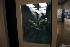 ▲左右牆壁的夾縫中展示的,是活用了連邦軍、自護公國軍MS的設定線稿,利用玻璃的特性所展示的魄力場景模型等,可以充分享受“MS”的魅力。