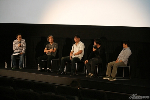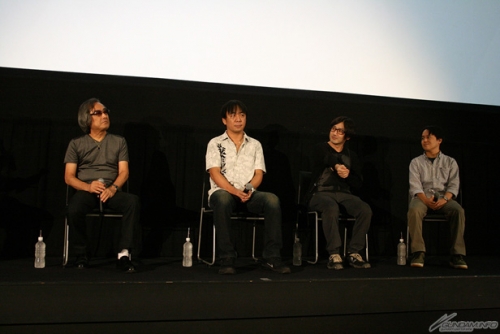 座談會首先登台的是擔任主持人的動畫研究家五十嵐浩司,接著是登台的來賓是大河原老師、大張老師、馬場先生、小川先生。結束了問候之後座談會馬上就開始了。