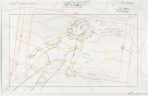 接著是關於「攝影」的話題。螢幕上顯示的是被稱作「版面設計」的圖片,說明到「這就是動畫製作中如“設計圖”一般的東西,利用這來結合人物及背景進行合成」。「版面設計」上也記載了「TU(Track Up)」等等相機相關作業。順帶一提這個「版面設計」,在『THE ORIGIN』中畫了800幕以上的張數。