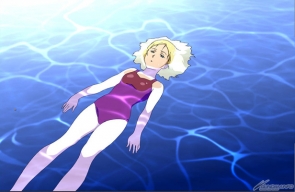 ▲雪拉在游泳池裡場景的版面設計(左)、此為左邊版面的完成畫面(右)。