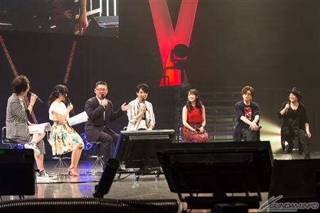 到了這邊準備了很大的驚喜。隨著未經預告的影片發表了系列最新作「超級機器人大戰V(=Voyage)」的製作。高達系列中收錄了『機動戰士Ζ高達』、『機動戰士高達ΖΖ』(發表時會場響起了很大的歡呼聲!)、『機動戰士高達 逆襲的馬沙』、「機動戰士海盜高達」、『機動戰士高達SEED DESTINY』、『劇場版機動戰士高達00 –A wakening of the Trailblazer-』、『機動戰士高達UC』等7部作品。此外,「V」初次登場的作品有「機動戰士高達 閃光的哈薩維」和「機動戰士海盜高達」系列的「骷髏之心」、「鋼鐵的7人」。都是沒有影像化,粉絲們期待收錄已久的人氣作品,發表時會場響起了驚訝的呼聲。之後,為了紀念收錄『宇宙戰艦大和號2199』,ささきいさお登場演唱「宇宙戰艦大和號」的主題曲,座談會也邀請參與『宇宙戰艦大和號2199』的鈴村健一先生,和參與『CROSSANGE 天使與龍的輪舞』的水樹奈奈小姐也登台闡述對作品的熱情。