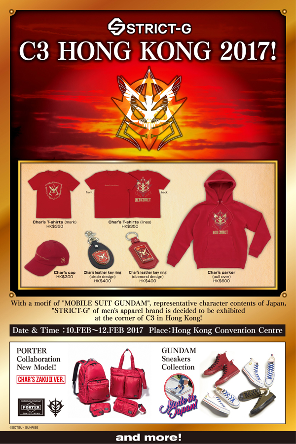 2月10日(五)至2月12日(日)的3日間,注入了高達世界觀的男士服飾品牌「STRICT-G」將會於香港會議展覽中心舉辦、以日本流行文化為中心的大型活動「C3日本動玩博覽2017」中出展!熱切期待各位的蒞臨!
