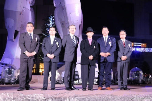 左起為Diver City Tokyo Plaza 管理中心所長 上野山勉、TOKYO 高達計畫2016執行委員會會長・東京港埠頭股份有限公司常務董事 前田敏宣、BANDAI NAMCO Holdings Inc.社長 田口三昭、『機動戰士高達』總監督 富野由悠季、SUNRISE股份有限公司社長 宮河恭夫、創通股份有限公司 副社長 出原隆史。