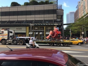 巨大立像般運中的一幕。奔馳在台灣街道上的立像之姿相當引人注目。