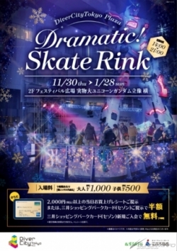 戶外型溜冰場「Dramatic溜冰場」位於Diver City Tokyo Plaza 2F節慶廣場的「實體大獨角獸高達立像」旁,時間至2018年1月28日(日)。場地採用樹脂板,能享受到溜冰的樂趣又不怕沾溼衣服,更利用了點燈裝飾表現出屬於冬季的浪漫空間。