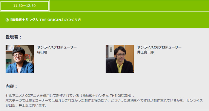 講座將由『THE ORIGIN』的谷口 理製作人和井上喜一郎CG製作人登台,以並用傳統動畫和CG動畫的本作為主題,來介紹製作過程及經過什麼樣的配合來製作出作品等秘辛。