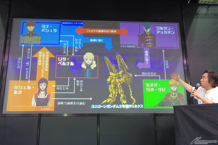 接著還介紹了擁有可愛的少女容姿,同時也身為緊握本作重要關鍵的MS「獨角獸高達3號機 鳳凰」的駕駛員莉塔・貝爾納爾,以及雖然馬沙在世的計畫已被粉碎,卻可說是最令人期待在本片登場的佐爾坦・亞卡寧。
