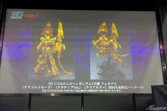 包裝盒採用主視覺圖,「HG 1/144 獨角獸高達3號機 鳳凰(破壞模式)(NARRATIVE Ver.)[透明彩色]初回製造限定包裝」,確定於各家上映電影院及高達東京基地發售。同時,高達東京基地也宣布確定舉辦「機動戰士高達NT世界」的活動。