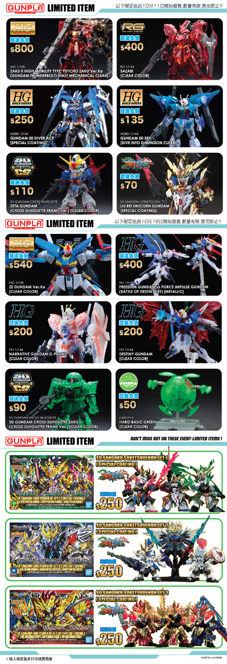 會場設有高達期間限定店,提供多款全新高達模型產品以供選購。大會更會推出12款會場首發限定版高達模型,限定版將會分階段推出,必定成為高達收藏家搶購戰利品的戰場!
