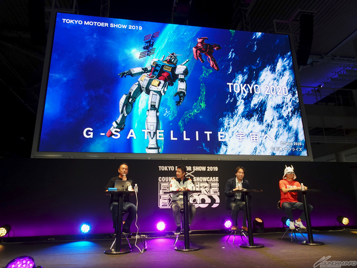 首先被問到的是天野春果「為什麼選擇高達呢?」,他回答道「一開始的契機是,將『發射衛星聲援奧運』這件前無古人的壯舉,由作為流行文化的『高達』來做的話不是很有趣嗎。接下來把小型人工衛星的專家青柳賢英、創建高達模型的山中信弘也一起拖下水開始了企劃,就持續到現在的情況了」。