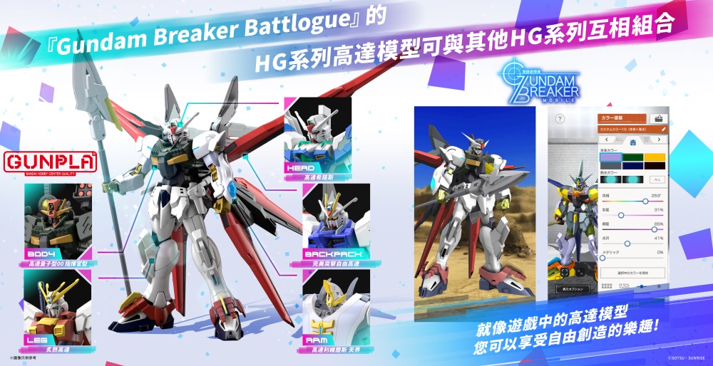 「HG Gundam Breaker Battlogue系列」,全系列皆內含構造改動及關節零件,可以自由組合頭・身體・手臂・腿部各零件,充滿可玩性的同時還能夠打造出專屬於自己的高達模型。