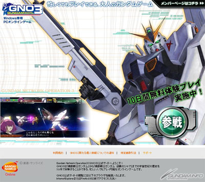 Gundam Network Operation 3 遊戲類型: 大型多人線上模擬策略遊戲(MMOSLG) 對應OS : WindowsXP/Vista/7(Windows7 32bit版、64bit版皆有對應) 發售廠商: BANDAI NAMCO ONLINE股份有限公司 月 費: 信用卡付費 1個月1,155日圓(含稅) 7-11付費・WebMoney付費・DOCOMO行動電話付費 3個月3,780日圓(含稅) |