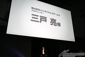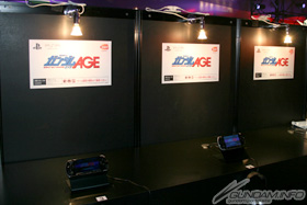 首先請到了遊戲發售商NAMCO BANDAI GAMES的製作人三戸 亮先生登台,他表示「高達AGE」將再次吸引小孩們,並以創造“新的高達世代”為目標。另外也介紹本作將透過各種與遊戲和動畫連動企劃的展開,吸引既存的動畫迷外各個年齡層的粉絲。