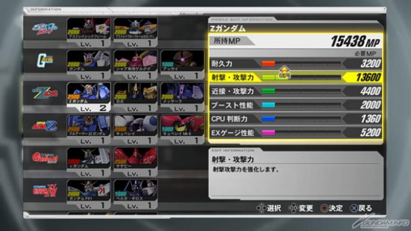 在「MS編輯」之中,可使用參加任務時獲得的「MP」強化機體的能力值。使用強化過後的機體後,說不定就可通過之前難以通過的任務了!?