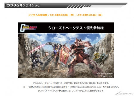 在測試實施之前,從9月20日(四)到23日(日)為止的4日之間,於千葉・幕張MESSE舉辦的「東京GAME SHOW 2012」會場内NAMCO BANDAI GAMES攤位,預定發布「封閉β測試優先參加權」的序列代碼,是「高達」5種類型的共通使用碼。