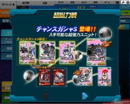 在超總力戰中獲得越多的分數,勝利的時候能抽的機會轉蛋次數也會增加。如果超過一定的積分,機會轉蛋的內容更會豪華升級。這次將有著能力遠超過以往、比過去總力戰中的稀有機體還要強悍的敵人會登場!