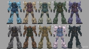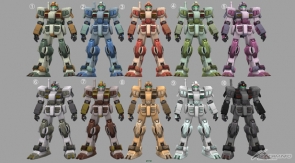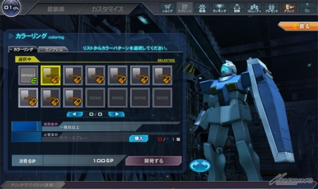 選擇機庫中的機體後,可以從選單中選擇「顏色變換」來變更機體的顏色。想要變更顏色,必須要滿足各種顏色的解鎖條件(會消耗専用素材「顏色噴罐」與一定額度的GP 等等)。