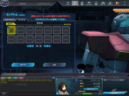截至目前為止雖只實裝了各部隊共有的「部隊徽章」,但接下來則可以貼上個人專用的機體徽章了。解鎖需要專用素材「徽章貼紙」與一定額度的GP 。有時也會需要達到一定階級以上才行。