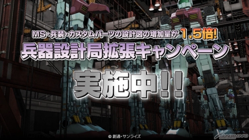 優惠活動期間當中、在戰闘報酬所得到的「MS設計圖」、「主武裝設計圖」、「改裝套件設計圖」的増加量將變為原本的1.5倍、會比平常更容易收集到設計圖。