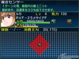 ▲RVF-25彌賽亞F魯卡專用機的「複合偵查器」能夠在1回合的期間內,使敵方機體的命中&回避率下降。